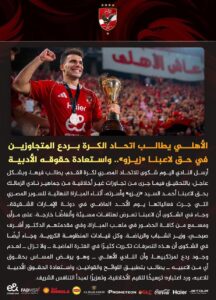 اصدر النادى الاهلى بيانا منذ قليل موجه الى اتحاد الكره يطالبه فيه بتحمل مسئولياته تجاه كل عناصر اللعبه وفتح تحقيق عاجل وحماية لاعب الفريق احمد مصطفى زيزو ومعاقبة المتجاوزين ضده اثناء مباريات بطولة السوبر المصرى التى اقيمت فى الامارات وتعرضه للسباب والخوض فى عرضه هو واسرته خصوصا فى المباراه النهائيه على مرأى ومسمع من الجميع وفى مقدمتهم اشرف صبحى وزير الشباب والرياضه.