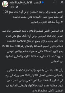 قرر المجلس الاعلى لتنظيم الاعلام ايقاف هانى حتحوت مقدم البرامج فى قناةmti وبرنامج مودرن سبورت ثلاثة اسابيع ومخاطبة كافة الجهات الخاضعه لتنظيم الاعلام بمنع ظهور المذكور طوال تلك الفتره ، كما تقرر تغريم القناه100الف جنيه وذلك بعد التحقيقات التى تمت مع الممثل القانونى للقناه وثبوت مخالفة حتحوت للاكواد الاعلاميه..جاء ذلك على خلفية الاخبار التى تناولها حتحوت فى برنامجه عن وجود خلافات داخل مجلس ادارة الاهلى وتهميش دور الكابتن الخطيب رئيس النادى وذلك على خلاف الحقيقه الامر الذى يضر بالاهلى ادبيا ومعنويا ويضرب استقرار النادى اداريا وفنيا.